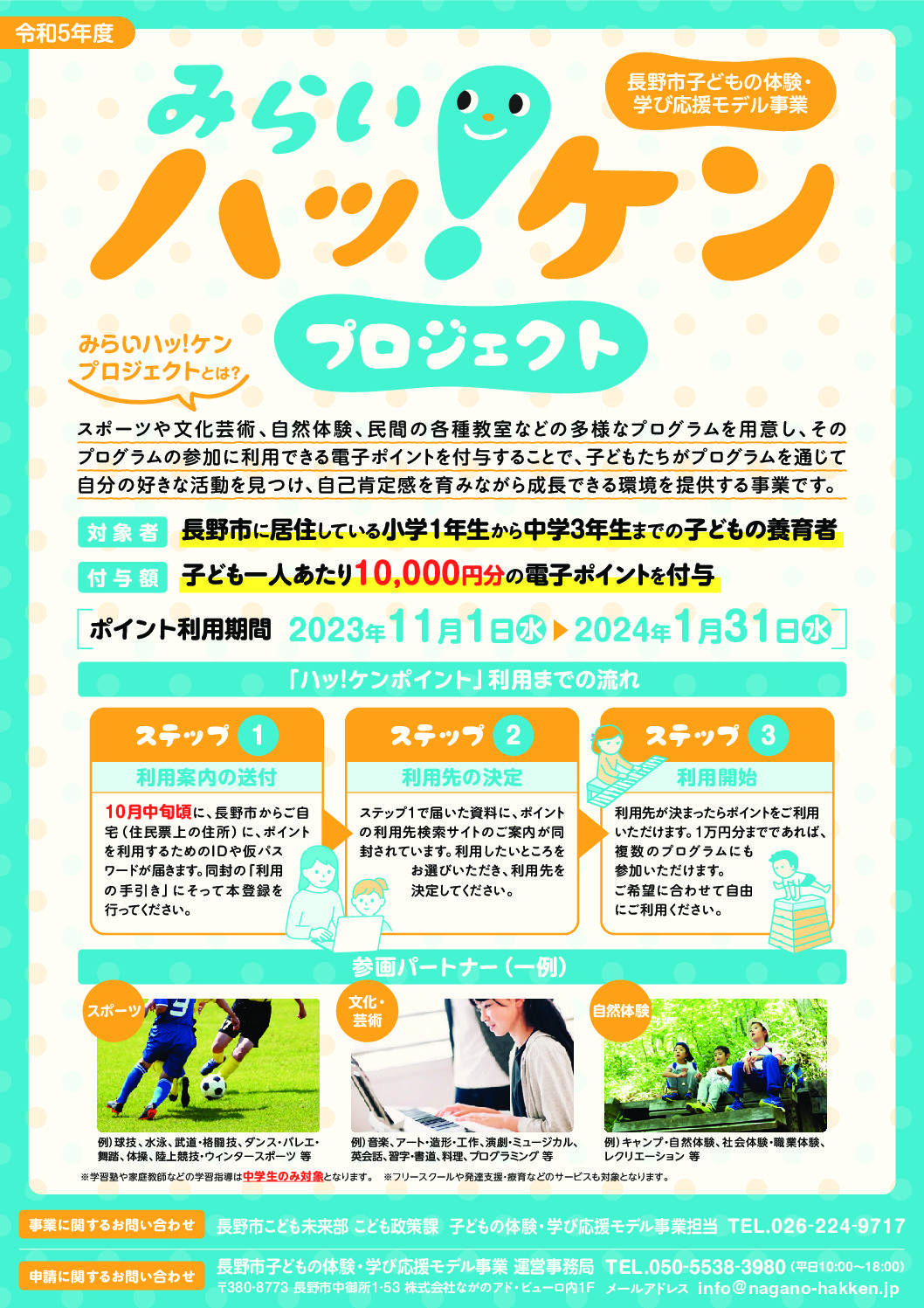 長野市内の小中学生を対象に、スポーツや文化芸術、自然体験、民間の各種教室などに利用できる1万円分の電子ポイントが配布され、子どもたちがプログラムを通じて自分の好きな活動を見つけ、自己肯定感を育みながら成長できる環境を提供する事業です。