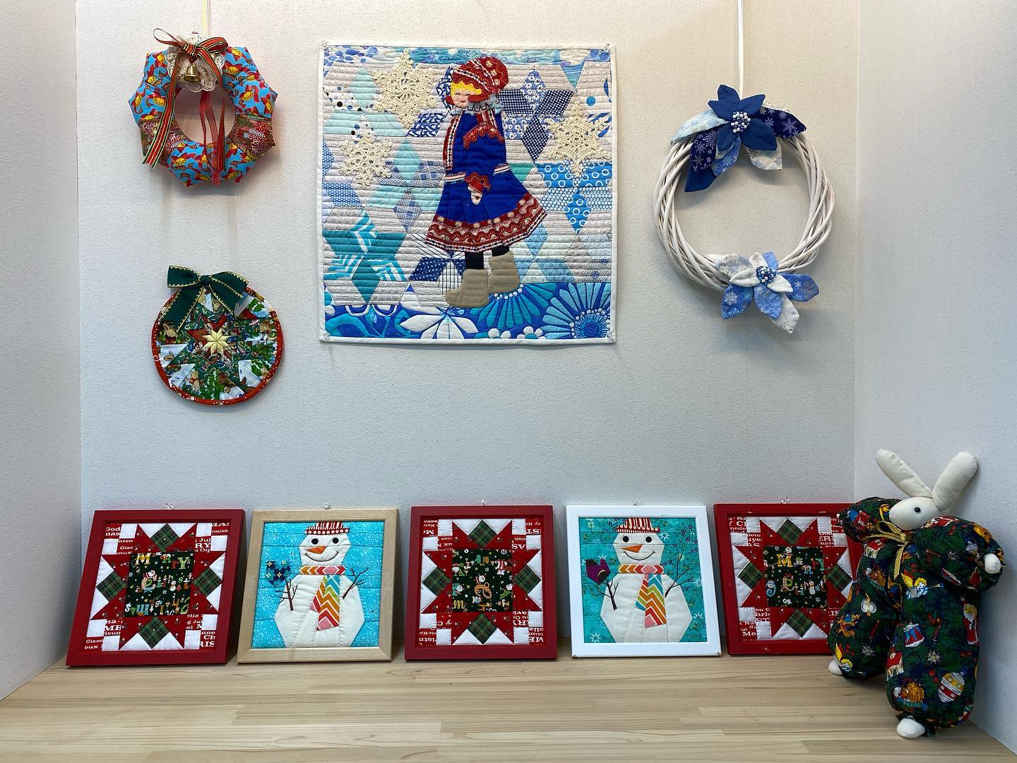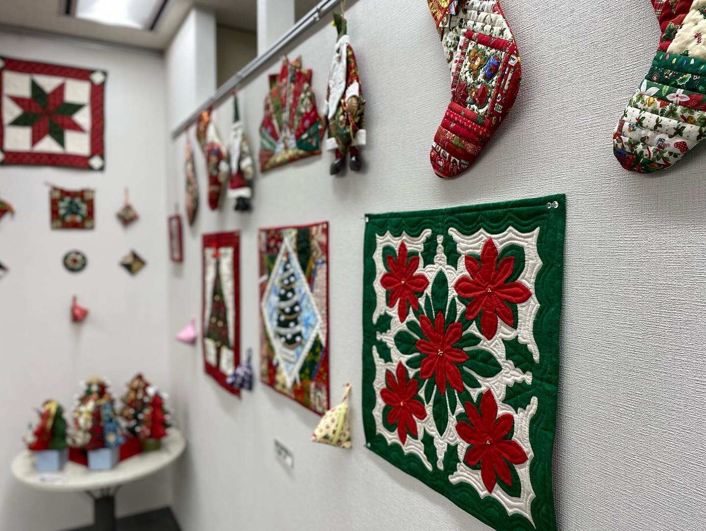 ただいまカルチャーセンター2階受付前にて「ハートフルキルト・パッチワーク」講座の皆様の作品が展示されています♪クリスマスのかわいい作品たちです