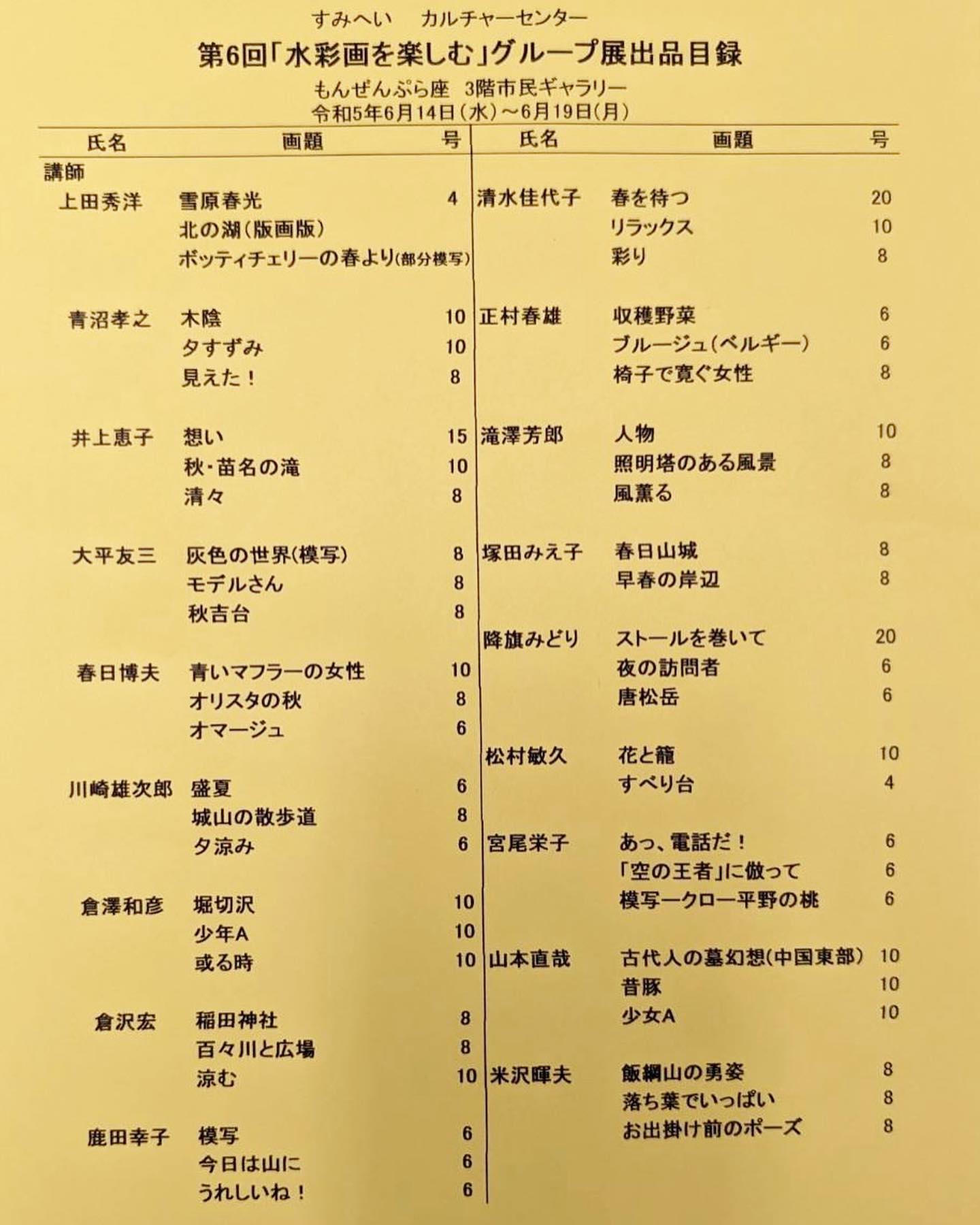 すみへいカルチャーセンターの「水彩画を楽しむ」講座の皆さまの作品が展示されています。