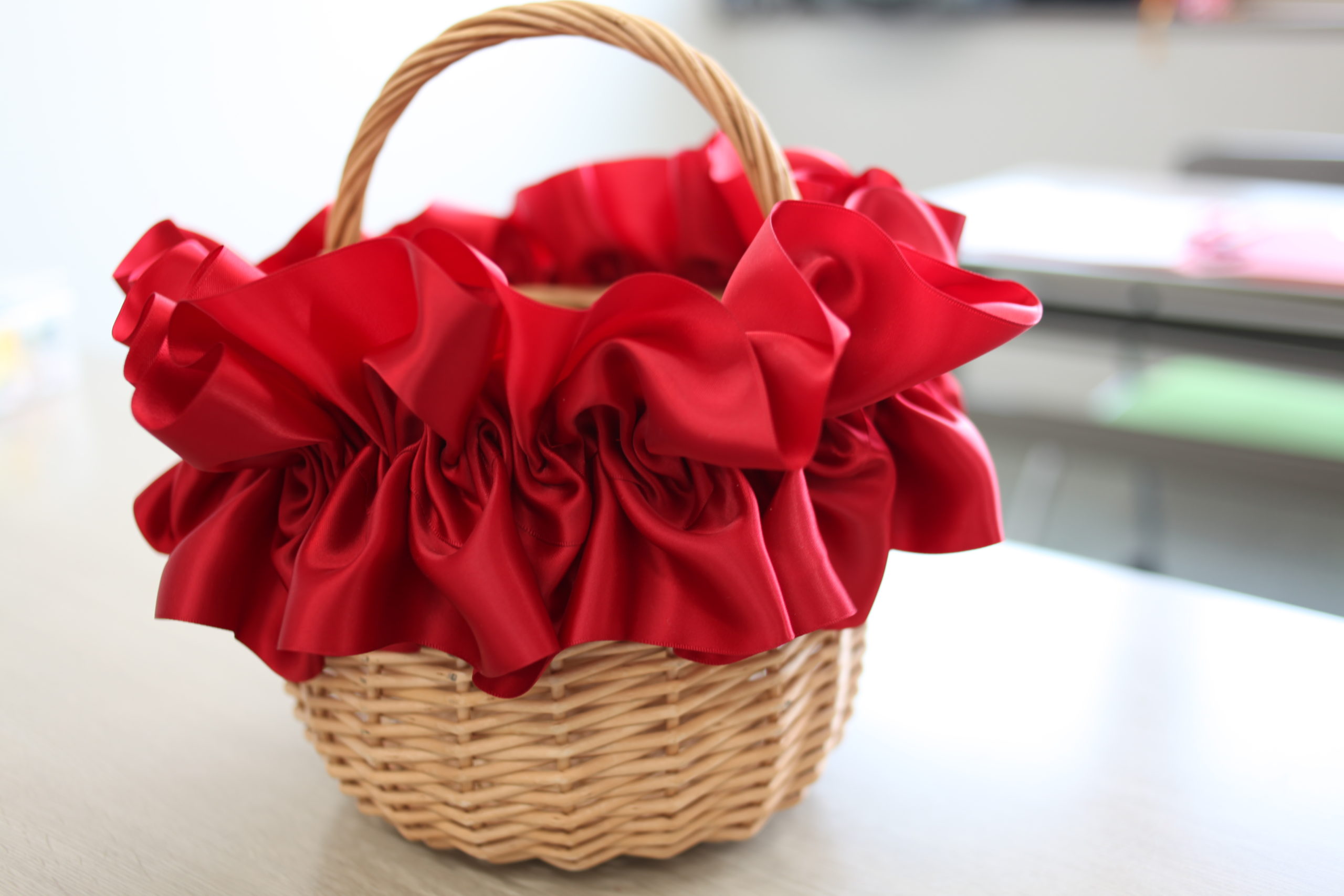 上品なフリルで大人可愛いフラッフィーバッグ。リボンの色はもちろん、トートバッグは大・小もしくは2種のかごから選び、素敵なバッグを作りましょう。