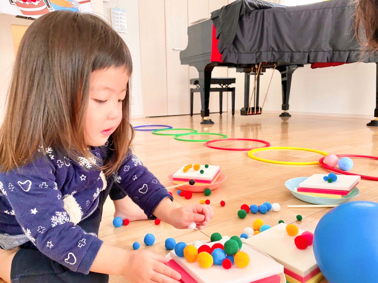 リトミックとは、楽しく音楽と触れ合いながら、基本的な音楽能力を伸ばすとともに、身体的・感覚的・知的にも、これから受けるあらゆる教育を充分に吸収し、それらを足がかりに大きく育つために、子どもたちが個々に持っている「潜在的な基礎能力」の発達を促す教育です。『できた!楽しい!』がいっぱいのリトミック。