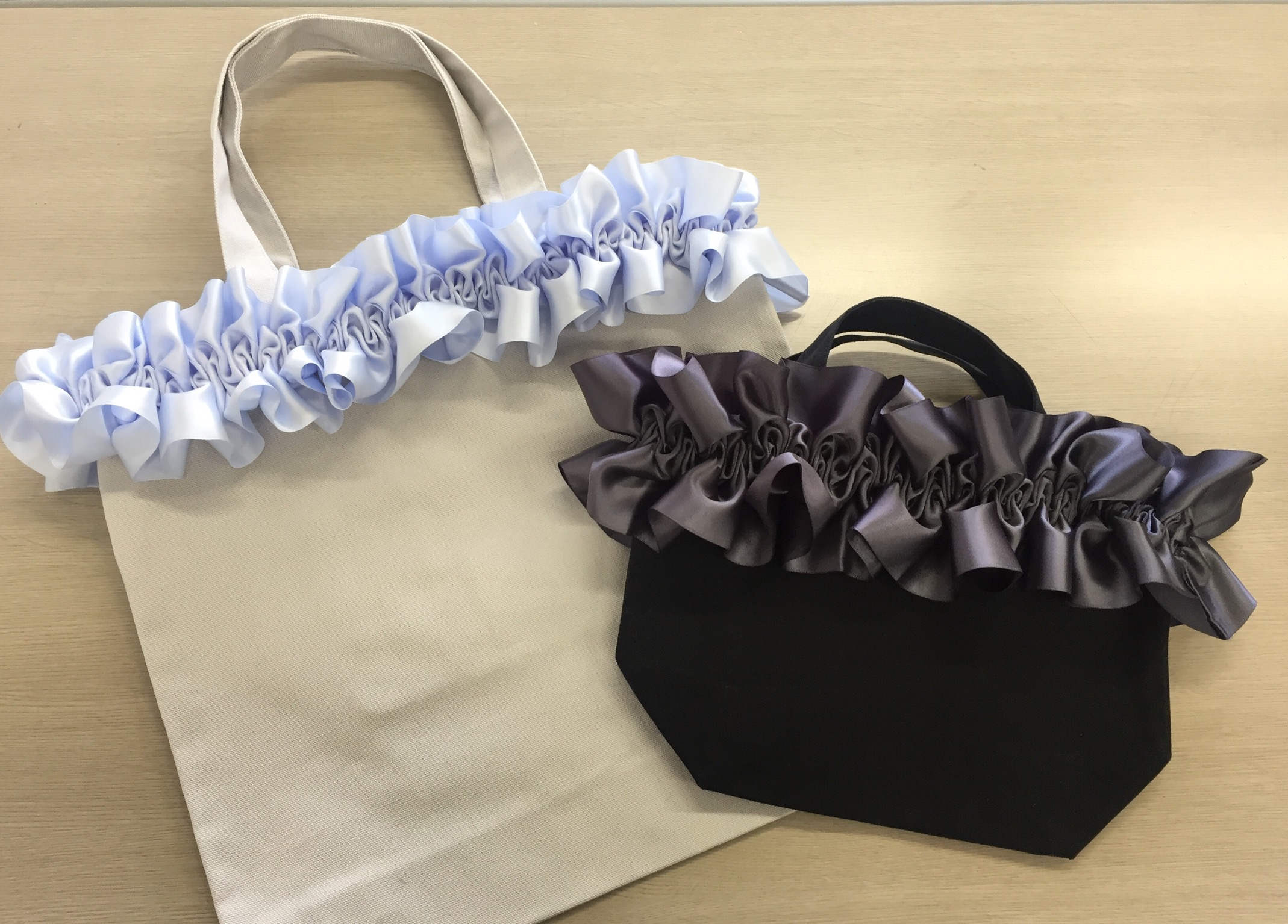 バッグの口にボリュームのあるフリルを施し華やかに仕上げます。リボンの色やサイズによって雰囲気も変わります。子供から大人まで幅広く使えるバッグです。