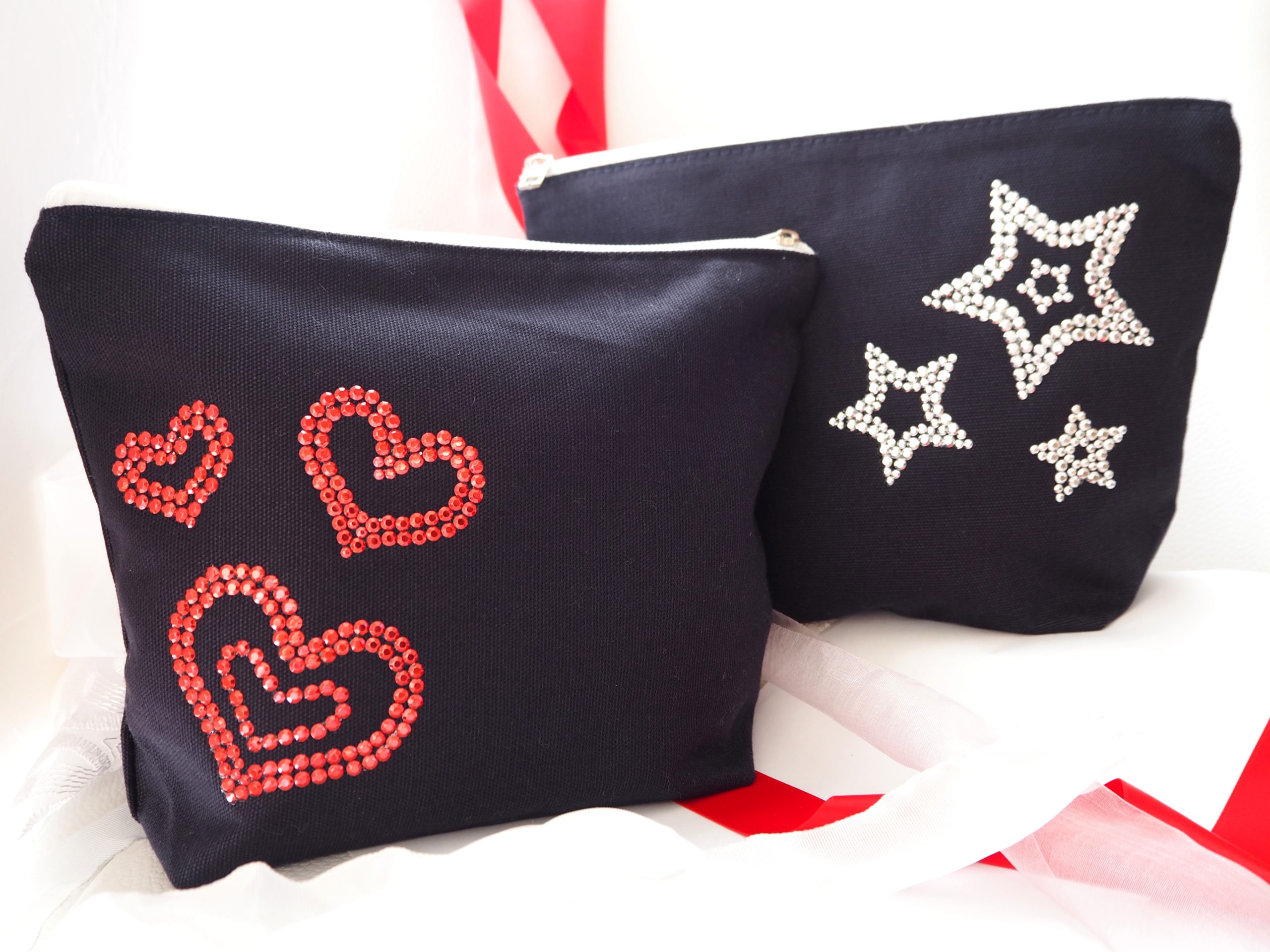 キラキラビジューでシンプルな小物や服が簡単に大変身!今回の素材はポーチ。ビジューは5色っから、モチーフの配置もご自由です♪テンションUPで日常をより豊かに♡