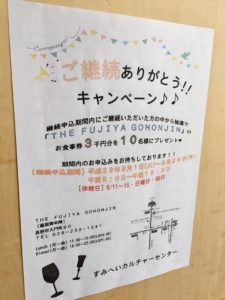 すみへいカルチャーセンターは皆様の「ヤル気」を応援します!!継続申込期間がスタートしましたよ!お申込み期間内に手続きしていただくと抽選で"THE FUJIYA GOHONJIN"のお食事券が当たるかも!?『ご継続ありがとうキャンペーン』を開催します!みなさんぜ…
