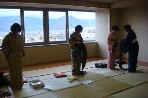 着物姿の女性ってステキですね~☆今日は「前で結んで後ろにクルッ!!簡単らくらく帯結び」講座におじゃましました(^ー^)v荻原先生の丁寧な説明を聞きながら、みなさん一生懸命帯をマキマキ~♪はっはやい!あっという間に完成です。スゴイ・・・(*_*;自分で着物の着付…