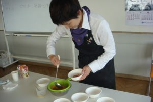 今日は野菜ジュースでカラフルな白玉を作りました。まぜまぜ…こねこね…カワイイ白玉がたくさんできました。