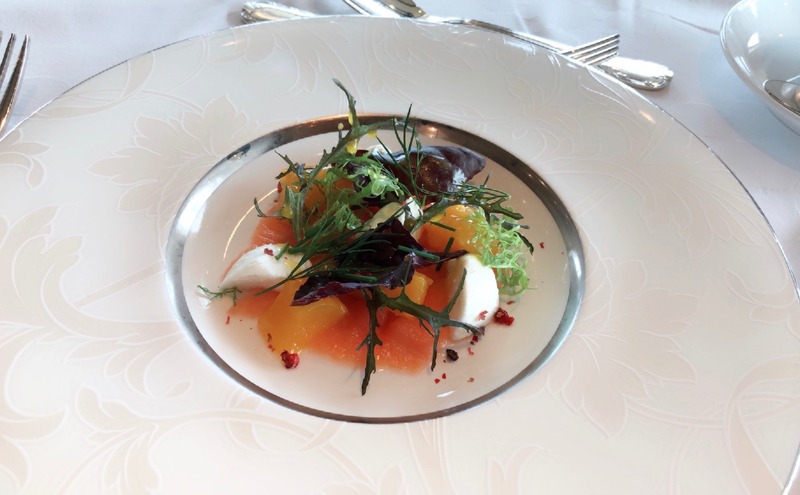 1枚目は前菜~スモークサーモン・モッツァレラチーズ・マンゴーのサラダ仕立て~です。