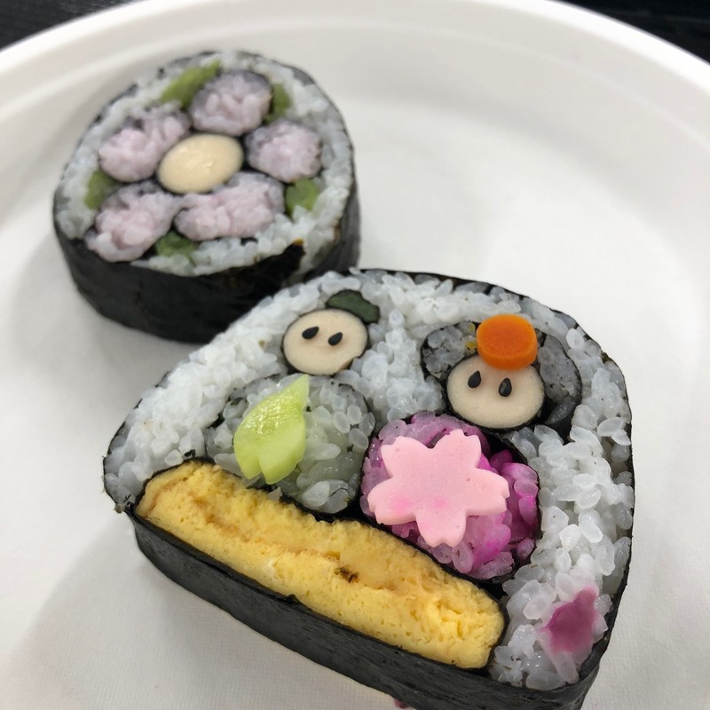 今日は「桃の花」と「めおと雛」の巻き寿司を作りました(^u^)
